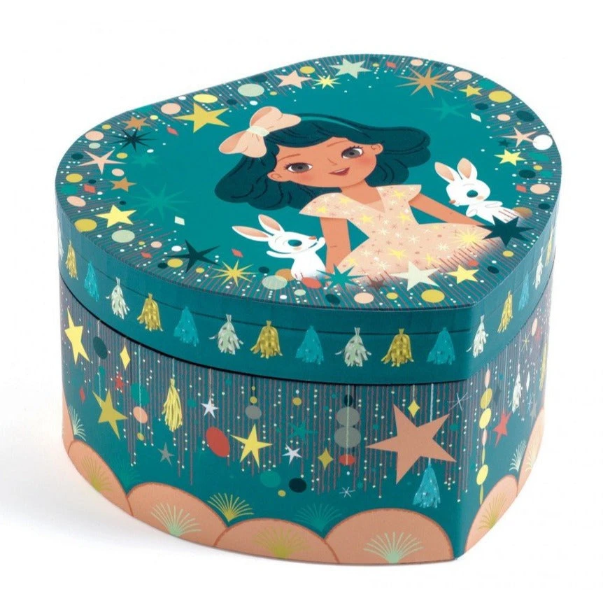 Een DJECO muziekdoos happy party voor bijoux in de vorm van een hart. Een sieradendoosje om je ringen, kettingen en haarspeldjes in stijl in op te bergen.