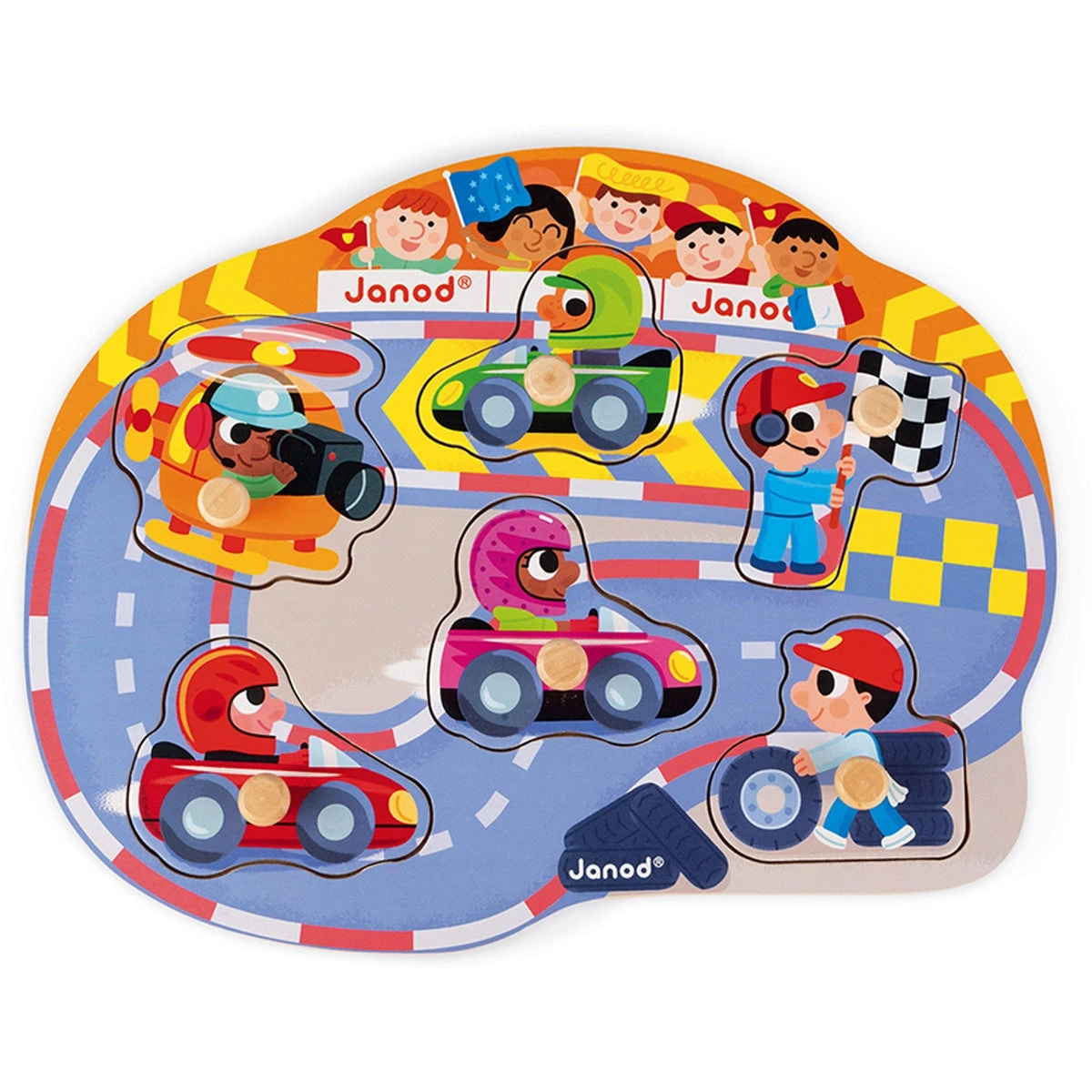 JANOD houten knoppuzzel racing, een stoere puzzel voor de allerkleinsten. De knoppen zijn makkelijk vast te houden. De puzzel heeft 6 vrolijk gekleurde puzzelstukken met raceauto’s.