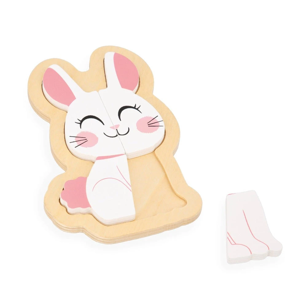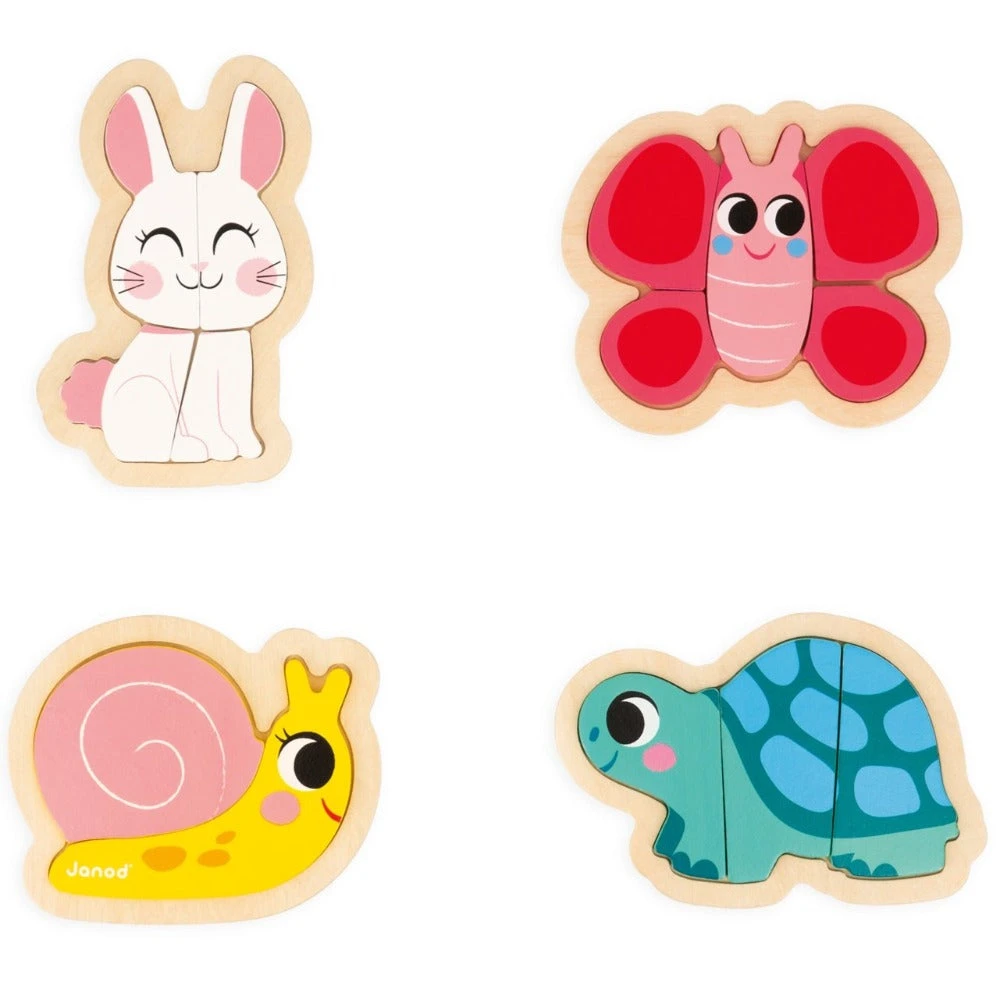 JANOD puzzels met 4 verschillende dieren met 2, 3, 4 en 5 houten puzzelstukken. De houten legpuzzels zijn geschikt voor kinderen vanaf 18 maanden.