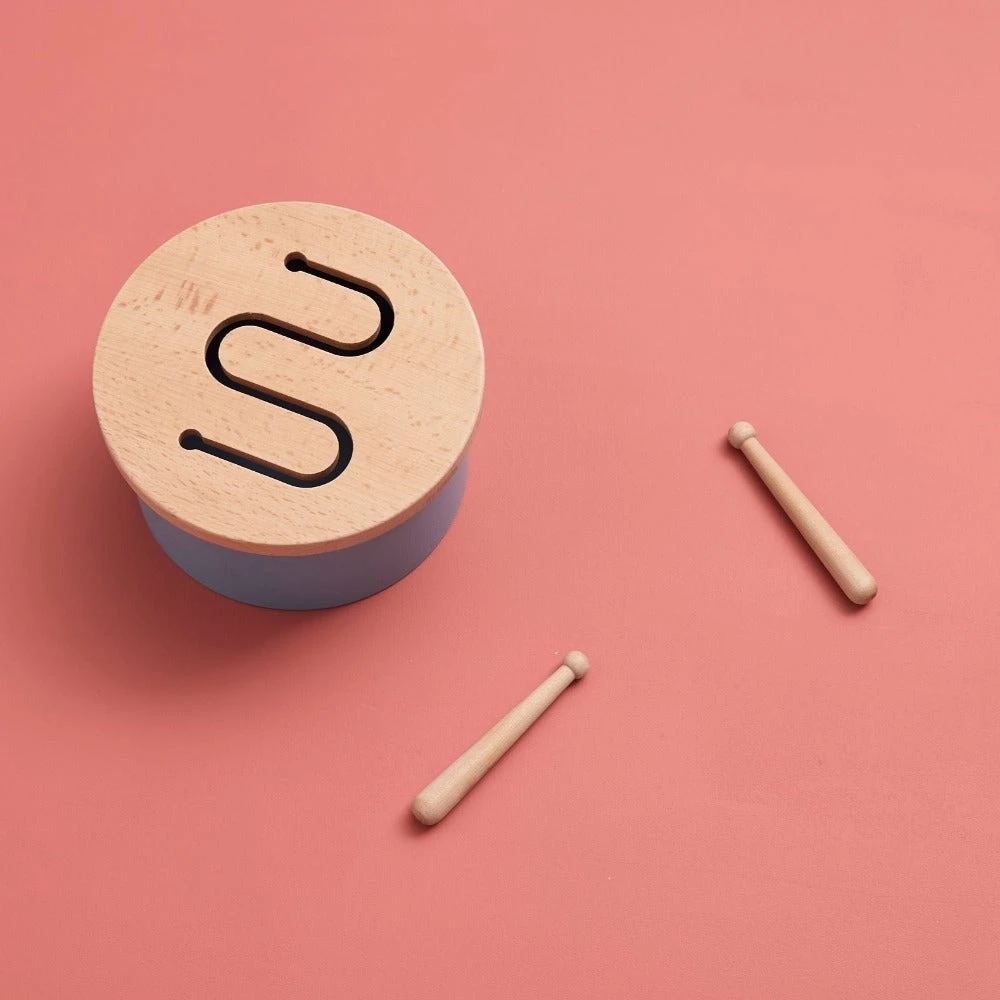 De openingen aan de bovenzijde van de trommel zorgen voor verschillende klanken tijdens het spelen. De houten muziektrommel is 16.8 x 8.9 cm, de stokken zijn 10.3 cm.