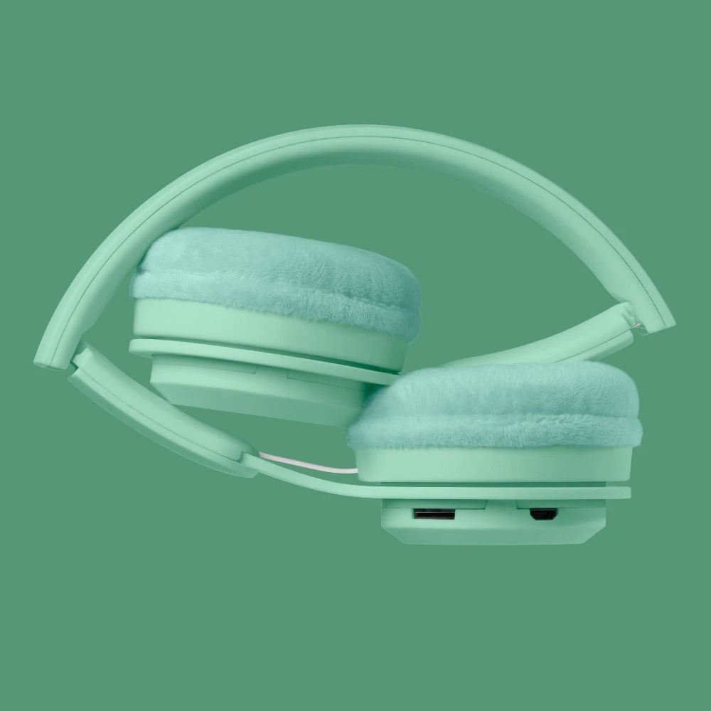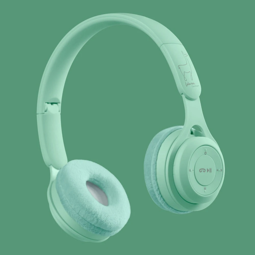 Lalarma opvouwbare koptelefoon groen, een draadloze verstelbare kinder koptelefoon met een draagtasje. De koptelefoon heeft een volume begrenzer tot 85 dB en werkt eenmaal opgeladen 6 tot 8 uur. De koptelefoon voor kinderen werkt via Blue Tooth tot ongeveer 10 meter maar kan ook met kabel gebruikt worden.