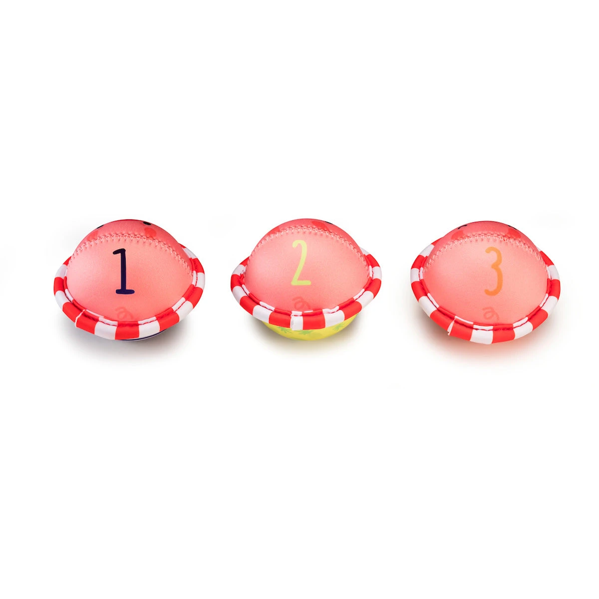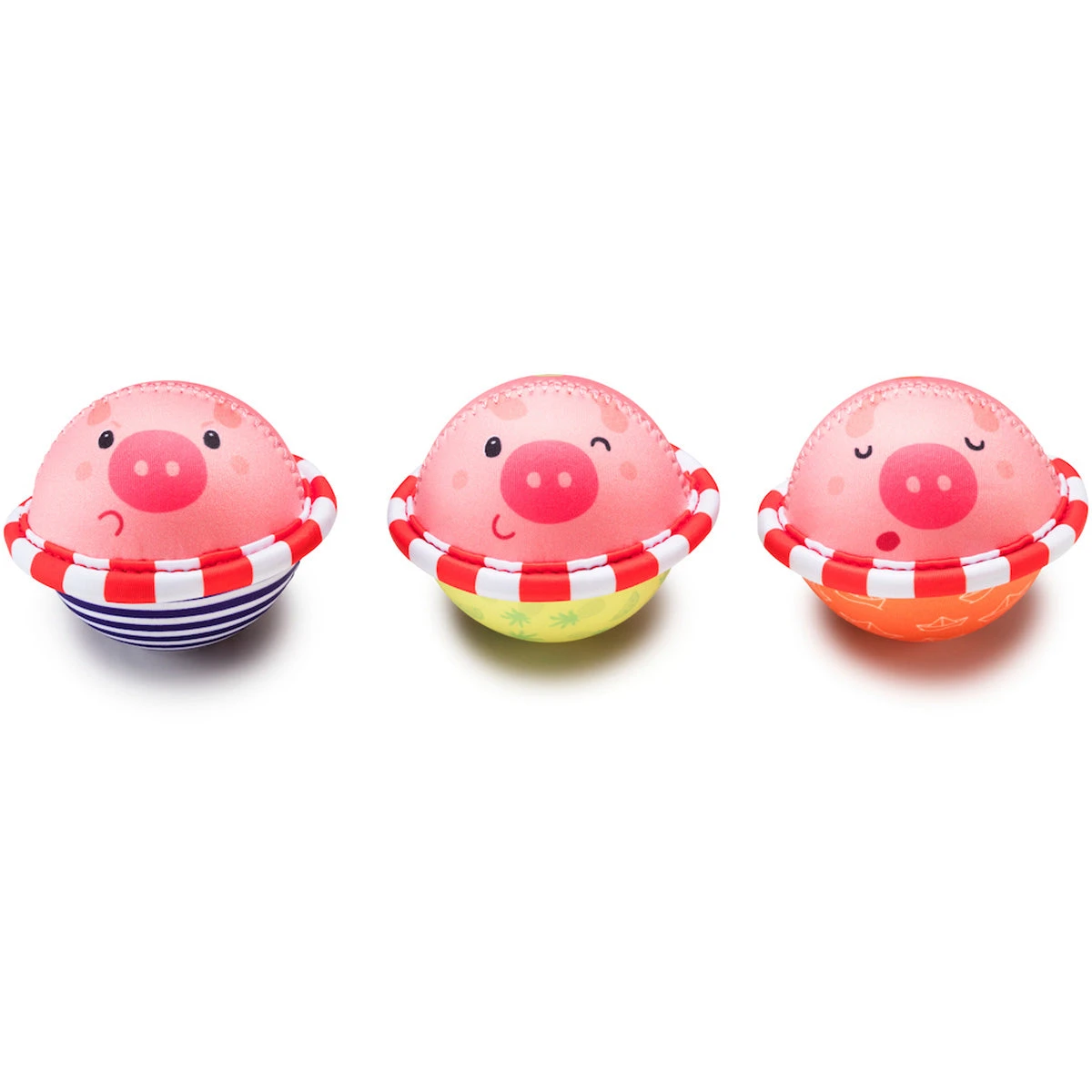 Bevestig de basket met zuignappen aan het bad of muur. De balletjes in de vorm van een biggetje drijven op het water. Gooi ze in de basket en kijk hoeveel punten je hebt verdiend!Â