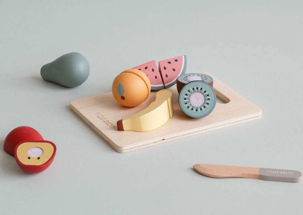 Little Dutch fruit met een snijplank, 6 verschillende stukken houten fruit en een houten mesje. Met deze set vul jij je speelgoedkeuken of winkeltje. Dit rollenspel speelgoed is geschikt voor kinderen vanaf 2 jaar.