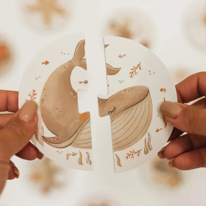 Een zandkasteel, een walvis maar ook een vis verkleed als onderzeeër, deze badpuzzel heeft de allermooiste ilustraties. De set bestaat uit 40 puzzelstukken / 20 puzzels. Elke puzzel heeft een doorsnede van 10 cm en is 2 cm dik.