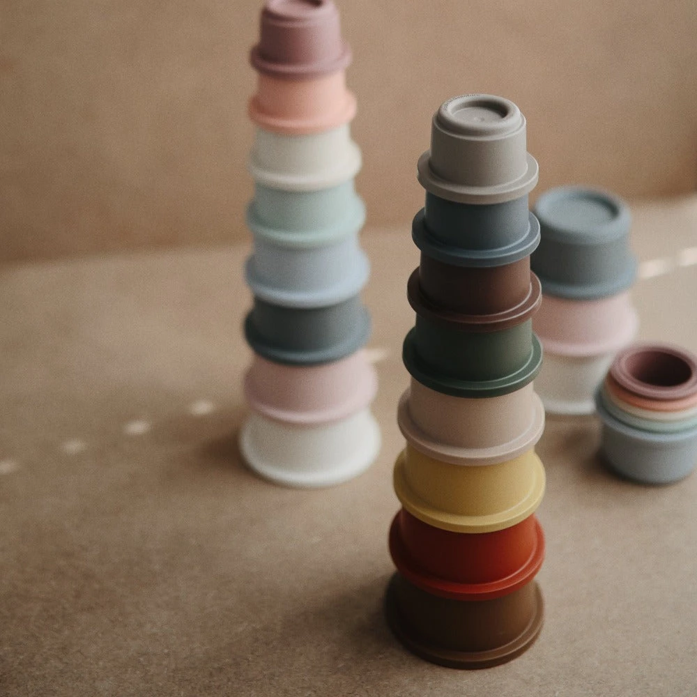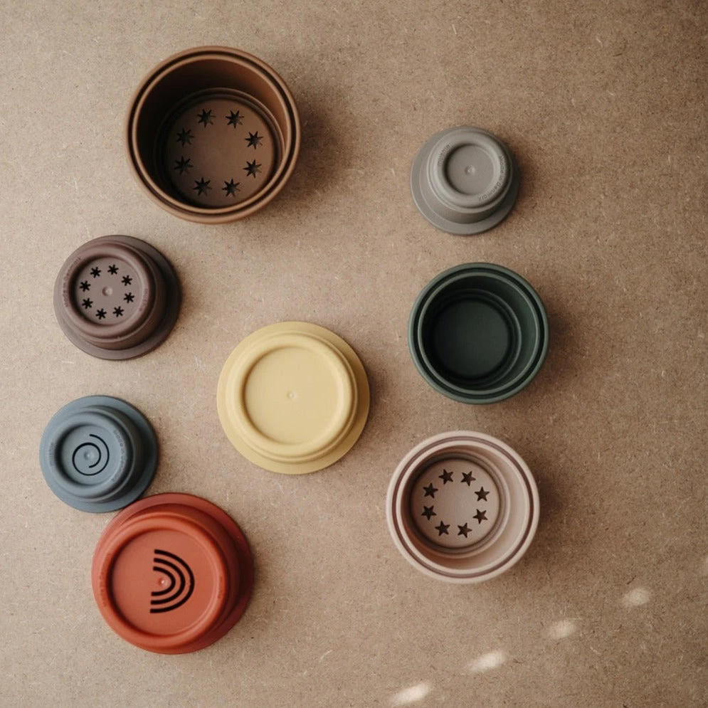 Mushie stapeltoren in diepe retro kleuren, een stapeltoren, stapelbekers en badspeelgoed in één. Babyspeelgoed voor in bad, op het strand of voor in de zandbak met een grote speelwaarde.
