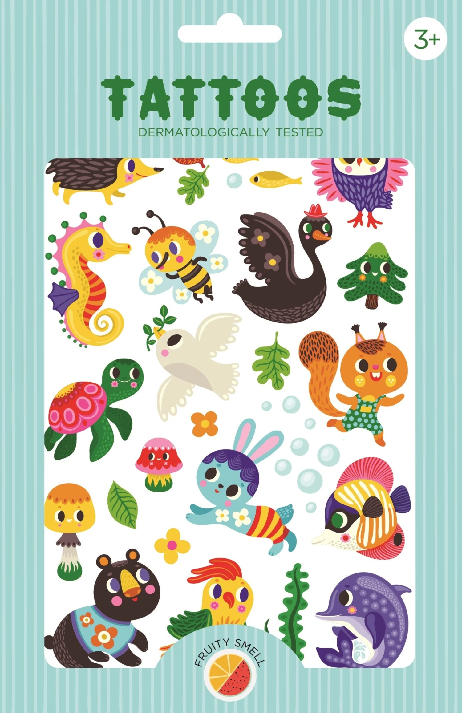 Een set van 2 vellen tatoeages van Petit Monkey We are family, grappige dieren in vrolijke kleuren. Tijdelijke kindertattoo’s, kinderen zijn er dol op, vooral wanneer ze zo grappig zijn.